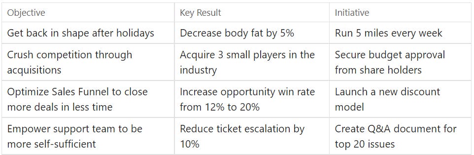 OKRs consists of three components - Objectives, Key Results and Initiatives.