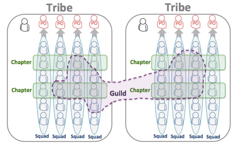 But, as noted, Spotify’s Model is very hard to implement as this is not a proper model but a way of working which evolved with time. It is too chaotic at the onset and having a central command structure is really hard. Why does it work? A squad owns a piece of production functionality and is free to play with it at it’s heart’s content. But, business architectures are not that simple!! Even there, it’s hard to manage when a tribe has seven teams and each of the seven follow their own agile model. But, yes. If you can enforce that a tribe can have a single model(meaning a single large feature owner should have only one model), this may work. Else, it gets too chaotic to use. Besides that, everything else makes absolute sense - especially the guilds, chapters and even the System Owner.