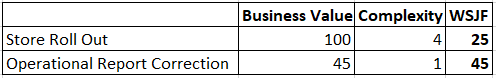 Store Rollout involving 100 stores having WSJF as 25 or correcting an operational report which is overquoting the numbers by 3% and impacting overall revenue but having a WSJF of 45?